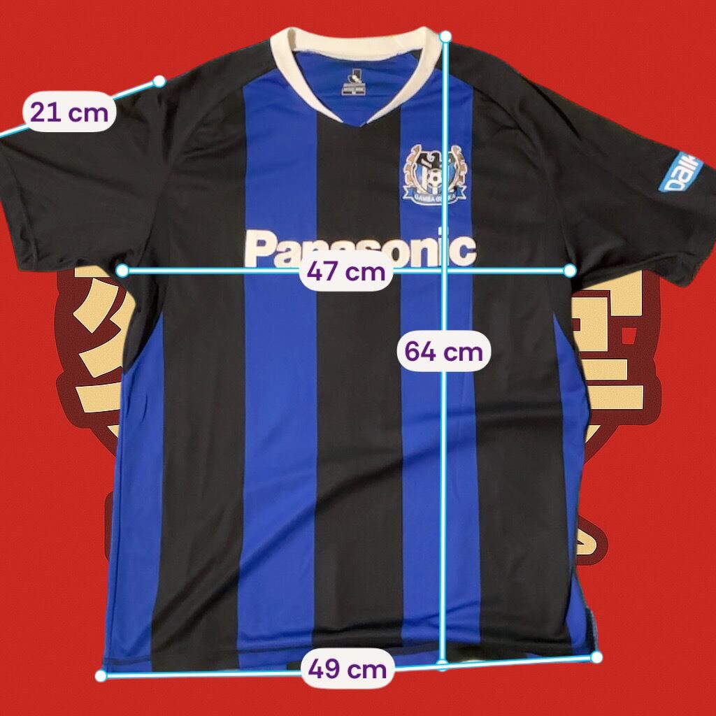 ブルーとブラックの縦ストライプが印象的な、ガンバ大阪らしさ全開の一枚です。白のVネックがアクセントになっていて、クラシックなJリーグユニフォームらしい雰囲気があります。袖にはスポンサー系パッチも入り、細かいディテールまでサッカー古着としての存在感があります。
