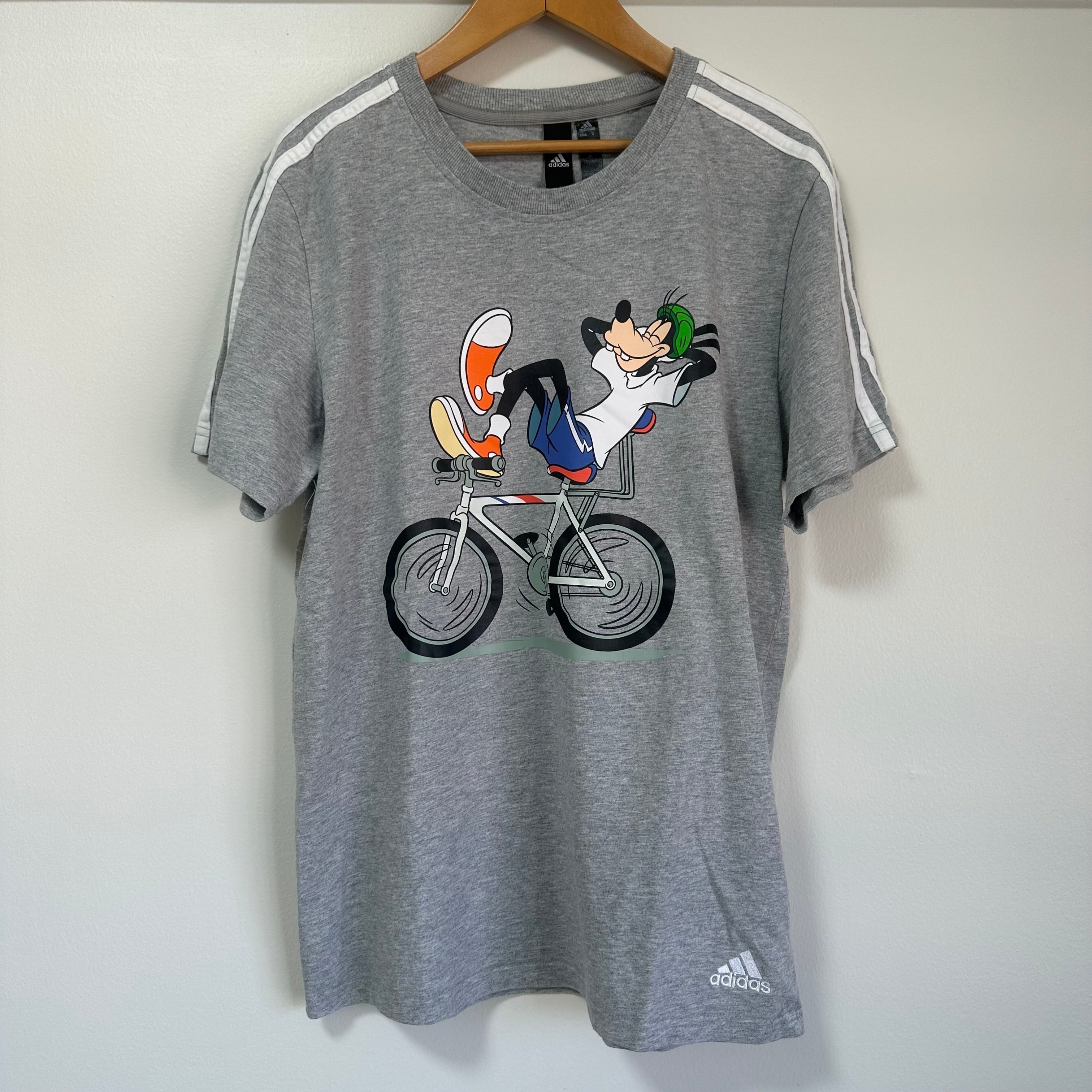 自転車に乗ったグーフィーのデザインがユーモラスで、カジュアルにもストリートにも映える一枚です。