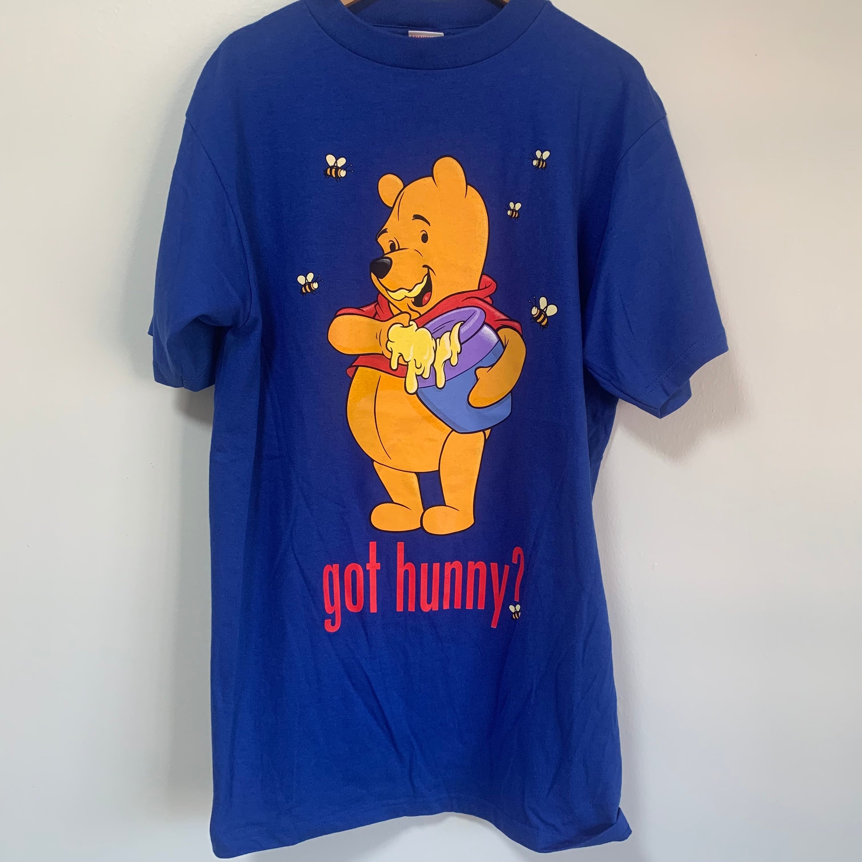 アメリカ製のヴィンテージTシャツ。大きくプリントされた「くまのプーさん」と“Got Hunny?”の英字ロゴが印象的。